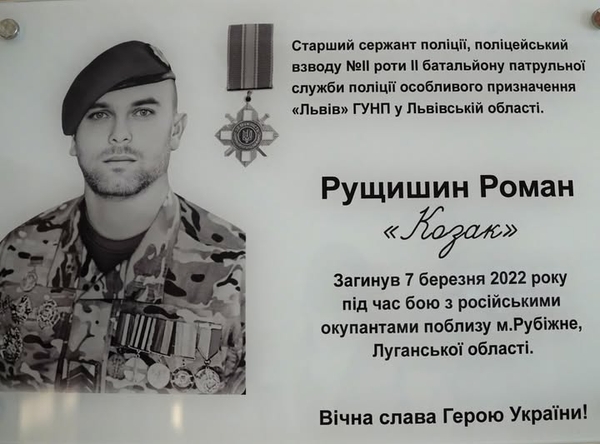 У селі Сопошин Львівського району встановили меморіальну дошку на честь загиблого поліцейського Романа Рущишина.