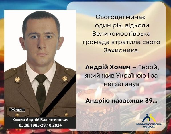 Today marks a year since the Velykomostivska community lost its Defender — Andriy Valentynovych Khomych, a courageous warrior, devoted patriot, loving husband, and father.