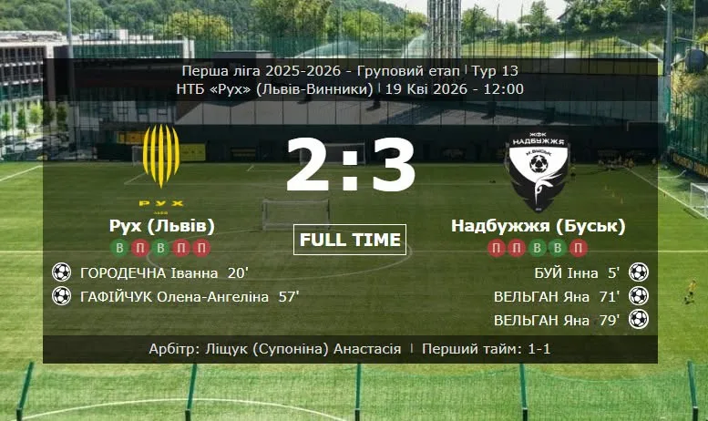 The women’s football club “Nadbuzhzhia” from Busk secured an important away victory against Rukh Women’s FC (Lviv-Vynnyky) with a score of 3:2. This was a match of the XIII round of the Ukrainian Women’s Football Championship for the 2025/2026 season among First League teams (Group A).