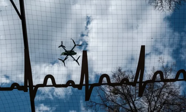 The installation is designed in the form of an anti-drone net interwoven with FPV drones, symbolising the “arteries of the front” — the roads used daily by the military and their supplies.