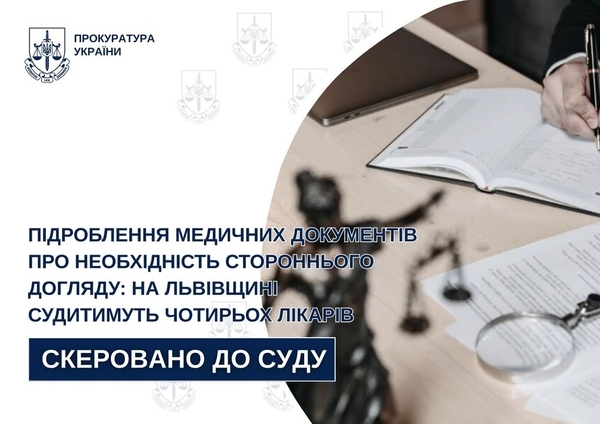 Prosecutors from the Zolochiv District Prosecutor’s Office have sent an indictment to the court against four hospital employees in the Zolochiv district. They are accused of falsifying official documents of a patient. **The investigation established** that in April last year, a family doctor entered data into the electronic system about a supposedly conducted in-person consultation and examination of an 88-year-old woman. In reality, the patient did not visit the medical facility — at that time she was residing in a nursing home.