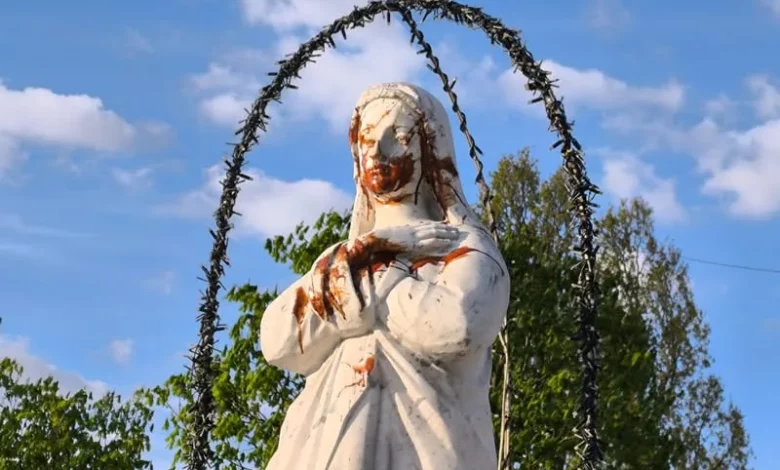 During the night in Zhovkva, an unknown individual committed an act of vandalism, desecrating the statue of the Blessed Mother located in the central Viche Square. It was recorded that the statue was doused with a red substance. The police are actively searching for the culprit, checking all the surveillance cameras in the city.