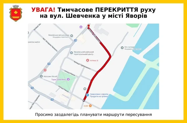In the town of Yavoriv, traffic on Shevchenko Street has been temporarily closed. Drivers are requested to consider these restrictions.