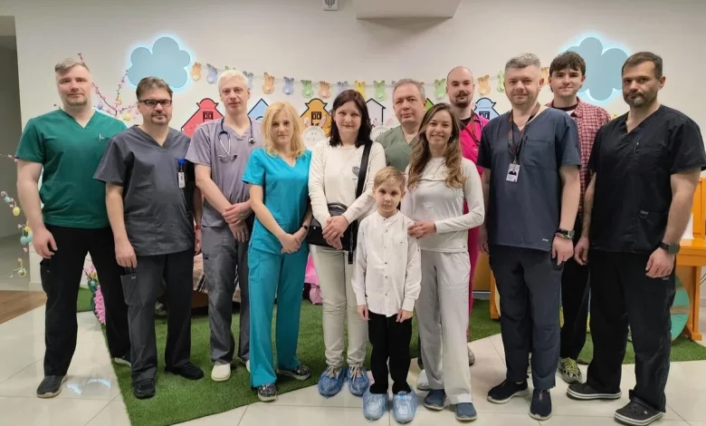 Smiling Yurchyk, along with his mother Iryna and the medical team, posed in the hospital lobby against a backdrop of vibrant decorations. Since the age of 4, the boy had suffered from nephrotic syndrome that had developed following tonsillitis.