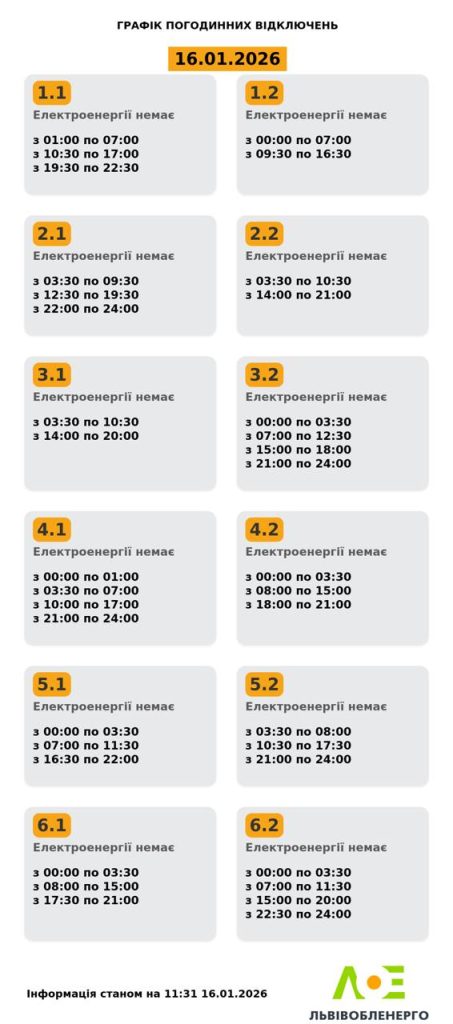 Ця інформація актуальна станом на 11:31 16 січня 2026 року. Львівобленерго рекомендує регулярно перевіряти оновлення графіків на офіційному сайті підприємства.