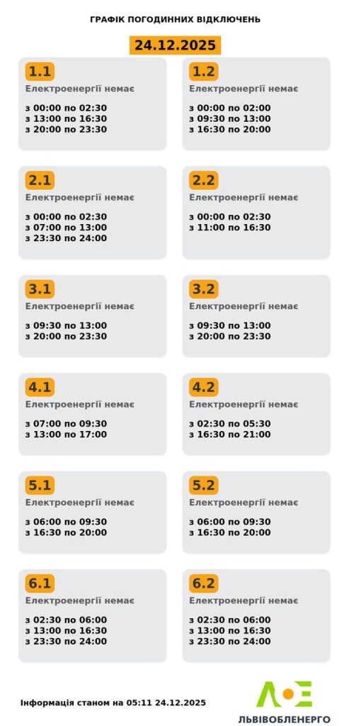 У Львівській області оприлюднено оновлений графік погодинних відключень електроенергії на 24 грудня 2025 року. Дані надані оператором системи розподілу Львівобленерго та актуальні станом на 05:11.