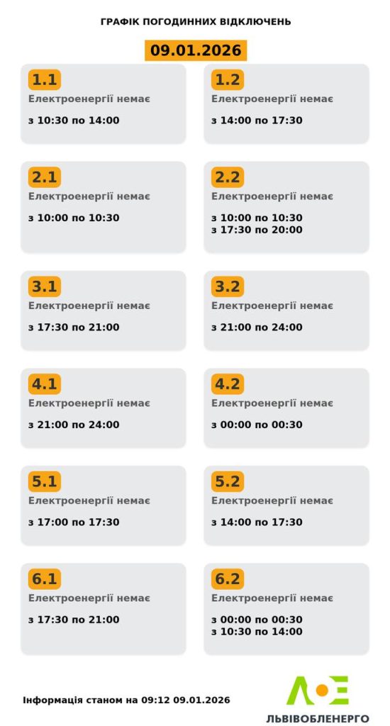 АТ «Львівобленерго» оприлюднило актуальний графік погодинних відключень електроенергії на середу, 9 січня 2026 року. Згідно з оновленою інформацією станом на 09:12, вимкнення заплановані для груп споживачів 1.1–6.2.