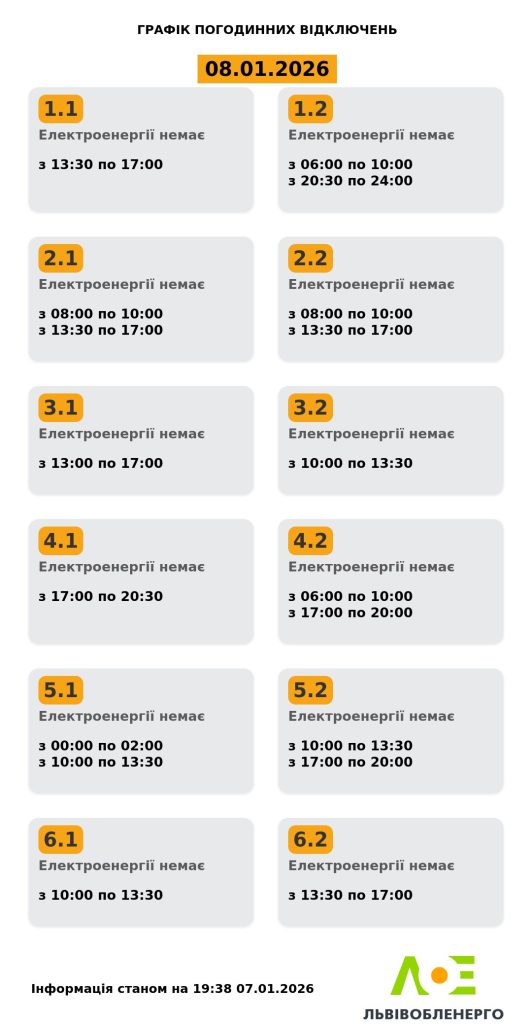 Інформація є актуальною станом на 19:38 7 січня 2026 року. Львівобленерго наголошує, що графіки можуть змінюватися залежно від навантаження на енергосистему та погодних умов. Рекомендується стежити за оновленнями на офіційних джерелах.
