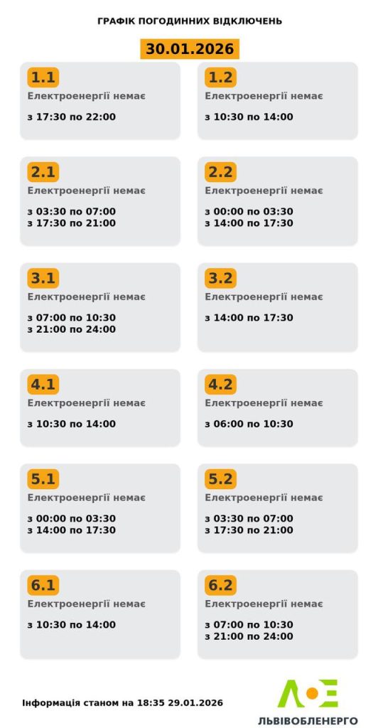 30 січня 2026 року у Львівській області буде діяти погодинний графік відключень електроенергії. Згідно з оновленою інформацією на 18:35 29 січня, АТ “Львівобленерго” попереджає про заплановані перерви в електропостачанні для різних груп споживачів.