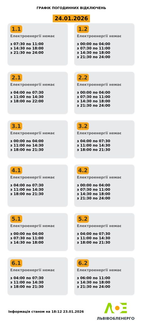 Компанія “Львівобленерго” оприлюднила оновлений графік тимчасових відключень електроенергії на 24.01.2026 для всіх груп споживачів у Львівській області. Відключення здійснюватимуться згідно з визначеним графіком у кілька часових проміжків.