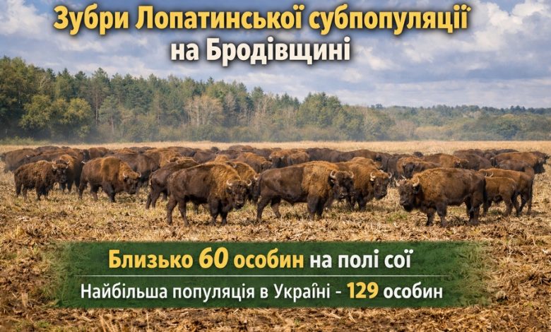 У Бродівському районі Львівської області зафіксували велике стадо зубрів, які занесені до Червоної книги України. Тварини вільно пасуться на полі з соєю, яке не було вчасно зібране через несприятливу погоду.