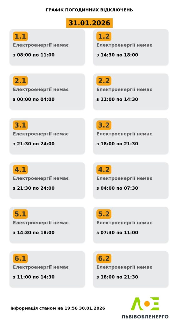 ПАТ “Львівобленерго” опублікувало графік погодинного відключення електроенергії на 31 січня 2026 року. Згідно з оновленою інформацією, електропостачання буде відсутнє у 12 підгрупах в різні проміжки часу.