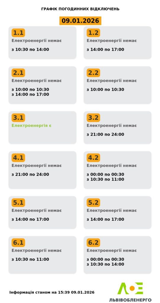 АТ “Львівобленерго” оприлюднило оновлений графік погодинного відключення електроенергії на 9 січня 2026 року. Згідно з інформацією, наданою станом на 15:39, знеструмлення відбуватимуться у різних групах споживачів у визначені години.