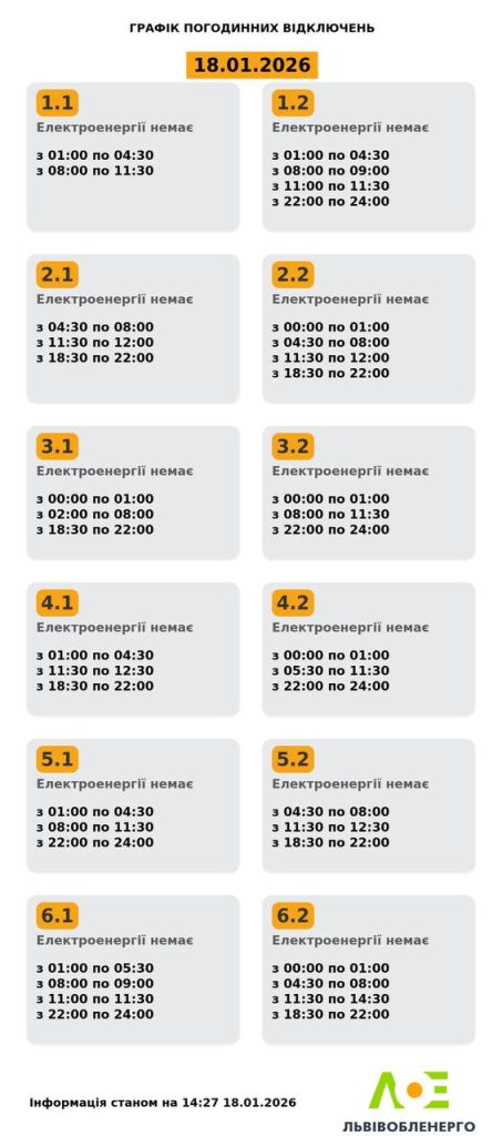 На 18 січня 2026 року ПрАТ “Львівобленерго” оприлюднило оновлений графік погодинних вимкнень електроенергії для жителів Львівської області. Згідно з новими даними, більшість груп споживачів залишатимуться без світла у декілька періодів протягом доби.