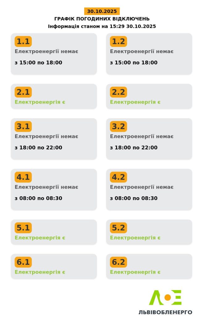 Станом на 15:29, 30 жовтня 2025 року, компанія «Львівобленерго» оприлюднила оновлений графік погодинних вимкнень електроенергії у Львівській області.