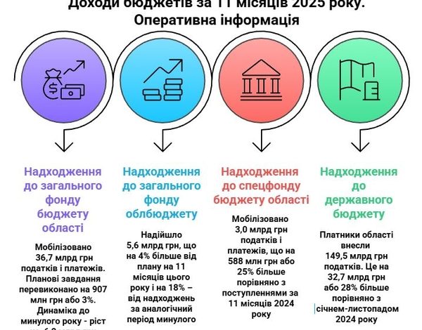Порівняно з 2024 роком, поступлення зросли на 6,2 млрд грн або 20%. До загального фонду обласного бюджету надійшло 5,6 млрд грн, що на 4% більше від плану на 11 місяців цього року і на 18% більше від надходжень за аналогічний період минулого року.