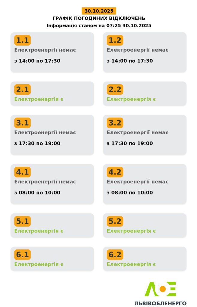 Львівобленерго оприлюднило оновлений графік погодинних відключень на 30 жовтня