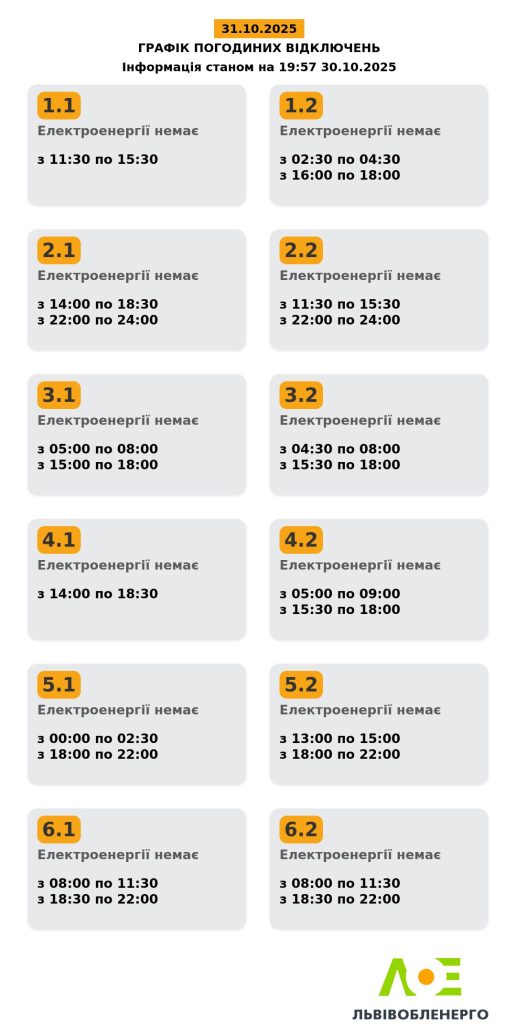 Енергопостачальна компанія актуалізувала інформацію про погодинні відключення електроенергії для споживачів Львівщини. Дані оновлені станом на 19:57 30 жовтня 2025 року.