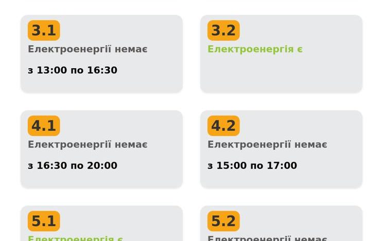 - Група 6.2 – електроенергії не буде з 13:00 до 16:30.
