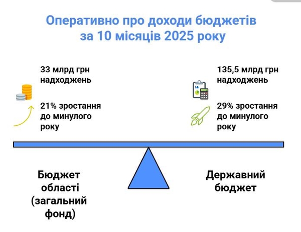 Порівняно з відповідним періодом 2024 року, поступлення зросли на 5,7 млрд грн або 21 відсоток. **До загального фонду обласного бюджету надійшло 4,9 млрд грн**, що на 2 відсотки більше від плану на 10 місяців цього року і на 18 відсотків – від надходжень за аналогічний період минулого.