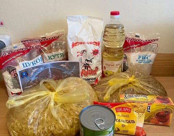 До складу кожного пакунка увійшли: олія — 1 л, рис — 1 кг, цукор — 1 кг, борошно — 2 кг, гречана крупа — 2 кг, макаронні вироби — 800 г, кутя — 900 г, консервований горошок, майонез, печиво «До кави», пачка чаю.