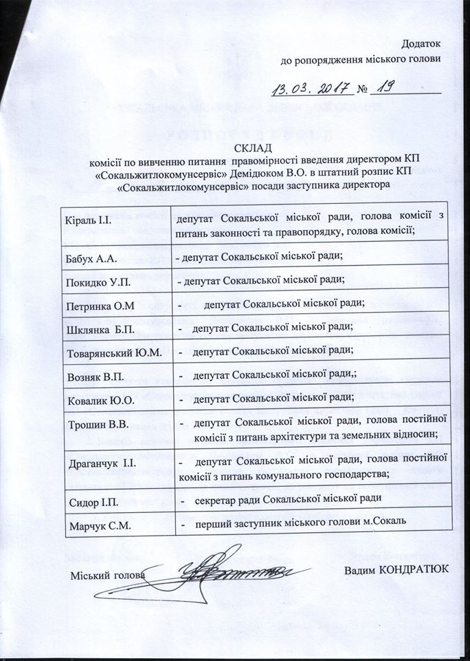 и создает комиссию по изучению вопроса правомерности введения директором Сокальжитлокомунсервіс Демідюком В.А. в штатное расписание предприятия должности заместителя директора, а также требует объяснения по поводу введения данной должности :