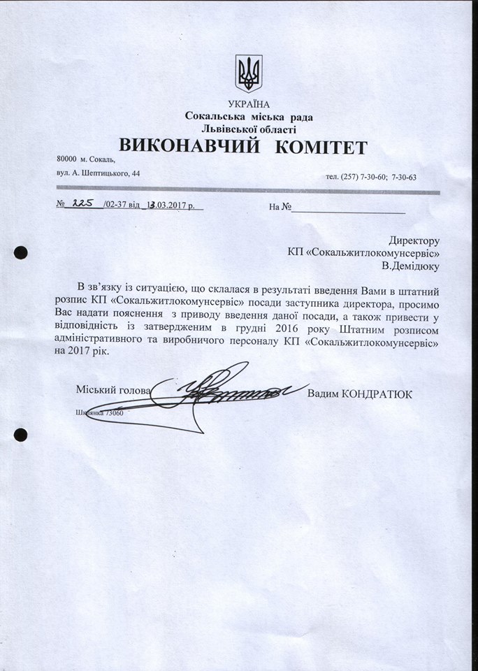 1 марта 2017 года городской голова Вадим Кондратюк представил сотрудникам КП «Сокальжитлокомунсервіс» нового директора Коммунального предприятия «Сокальжитлокомунсервіс». Им стал Демидюк Валерий Александрович, 1963 года рождения, образование высшее.